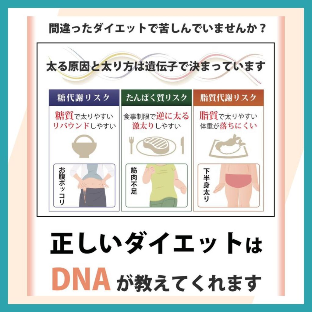 当店で導入したDNA検査を行い、糖質リスク・たんぱく質リスク・脂質リスクなどを調べ、効率よく痩せる指導を行います。